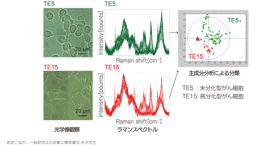 光学顕微鏡や形態的特徴に基づいた分類が困難な細胞においても、ラマン分光法と多変量解析(主成分分析)・クラスタリングを組み合わせることで分化状態の違いを判別できます。この手法は、細胞の管理や分化判別システムの確立への応用が期待されています。試料の前処理を必要とせず、そのままの状態での観察が可能です。