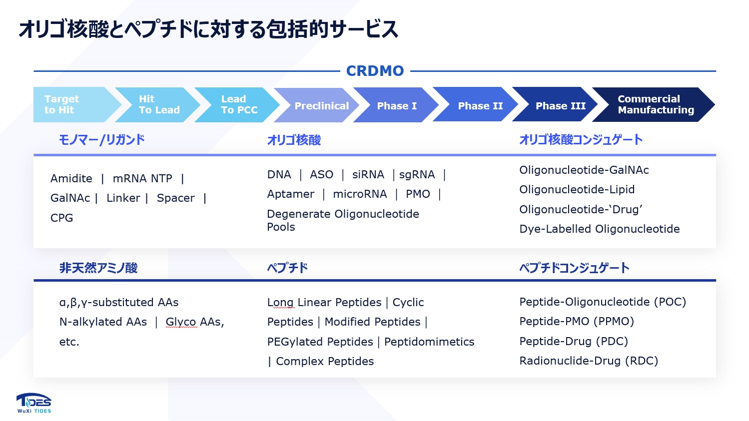 オリゴヌクレオチドやペプチド、それらのコンジュゲートのカスタム合成や製造サービスを提供しています。