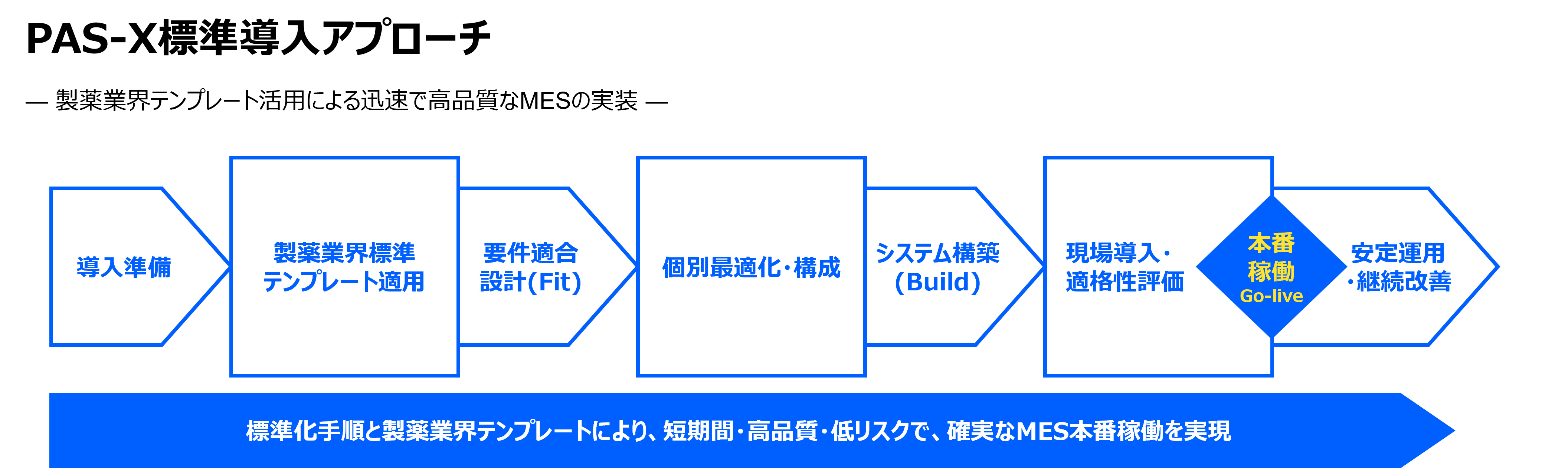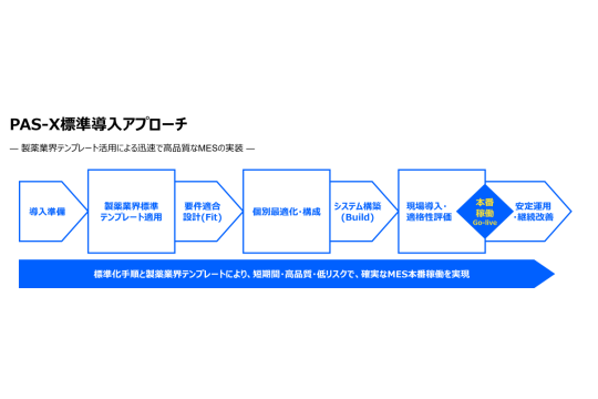 また、製薬業界標準テンプレートを活用した標準導入アプローチにより、短期間・高品質・低リスクでのMES本番稼働を実現します