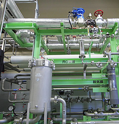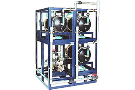 RO膜(逆浸透膜)を用いて、水中にあるイオンを90%以上除去し、TOC除去・微粒子除去を実現し、高純度の水を製造します。注射用水(WFI)や精製水の前処理システムに使われています。