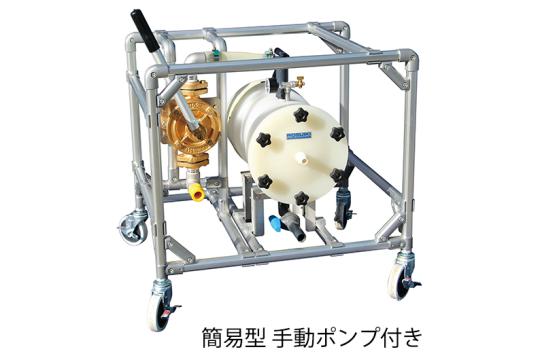 軽量コンパクトなキャスター付架台で、様々な場所で使用可能な移動式濾過機です。