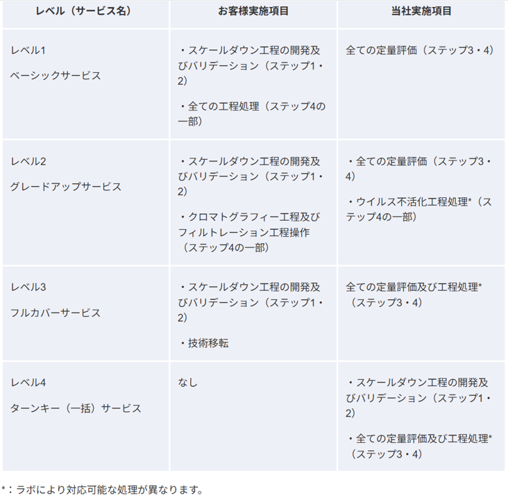 原材料の確認から工程の評価まで、バイオ医薬品の開発段階に応じて、ICH-Q5Aガイドラインに準拠した包括的な試験をワンストップサービスで提供可能です。